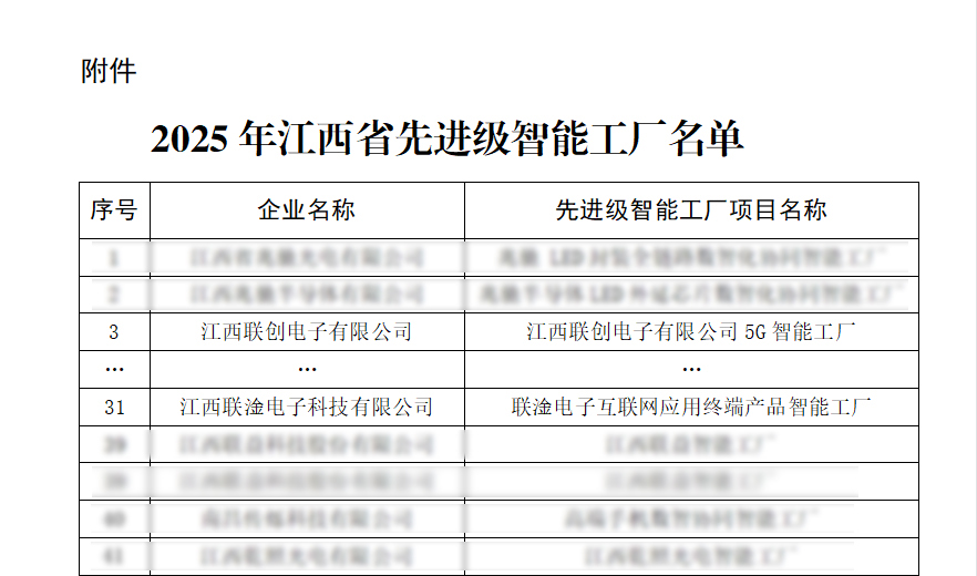近日,江西省工业和信息化厅正式公布2025年江西省“先进级智能工厂”名单,186家企业入选。其中开云在线,开云在线(中国)、江西联淦电子科技有限公司2家联创电子系企业名列榜单。这标志着公司在智能制造领域的创新成果再次获得政府权威认可。